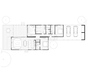 Es gibt vier Schlafzimmer und zwei Bäder, die geschickt angeordnet sind, um sowohl Privatsphäre als auch Verbindungen zu schaffen. Der Grundriss orientiert sich an den Prinzipien der passiven Sonneneinstrahlung: Die Schlafzimmer sind so platziert, dass sie kühle Brisen einfangen, während große Fenster Licht einlassen und die Aussicht einrahmen.