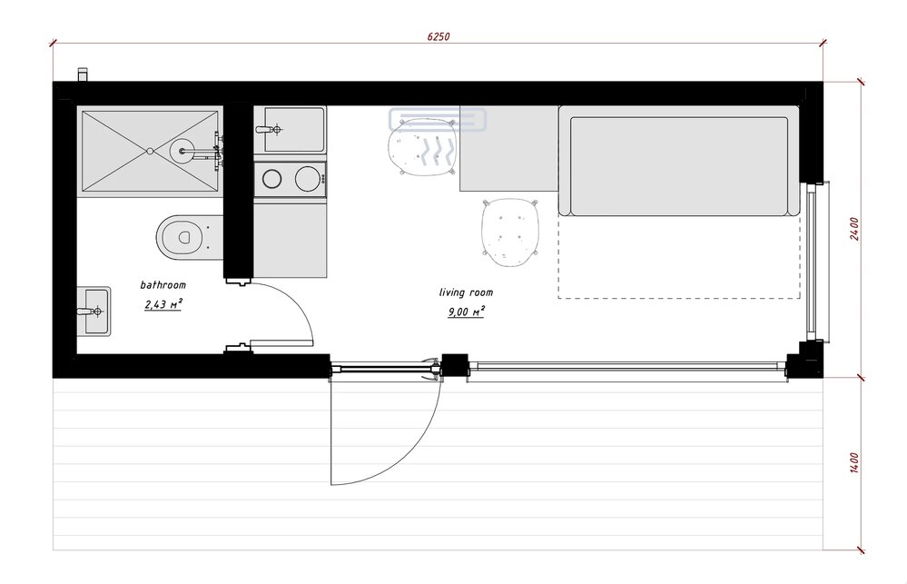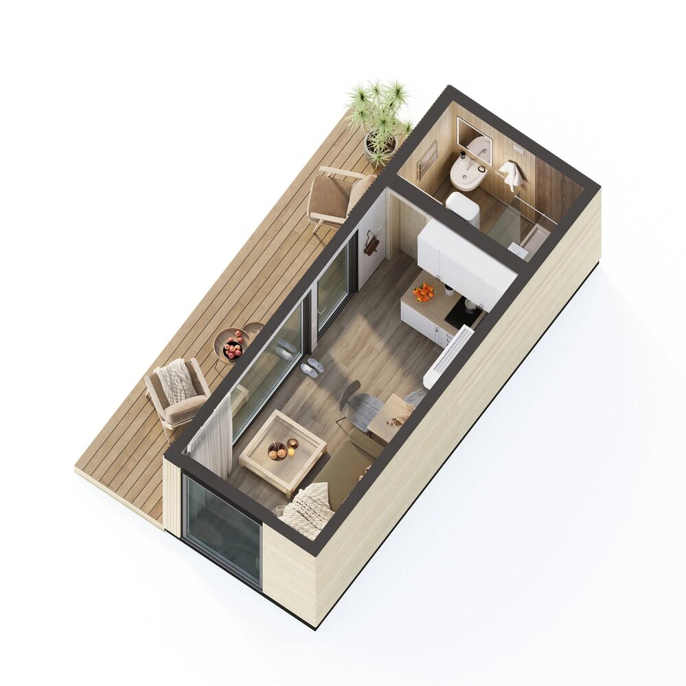 Compact LivingVorgefertigtes Tiny House 6,25m x 2,45m Perfekt für den Hauptwohnsitz, eine Gästeunterkunft, ein Ferienhaus, ein Büro/Atelier zu Hause, Mieteinnahmen (airbnb) oder ein Hotel.Dieser charmante Rückzugsort bietet ein harmonisches Gleichgewicht zwischen Komfort und Einfachheit und ist die ideale Wahl für alle, die einen gemütlichen und effizienten Lebensraum suchen. Perfekt als Hauptwohnsitz, Gästeunterkunft, Ferienhaus, Büro/Studio zu Hause, zur Vermietung (airbnb) oder als Hotel. Kann auch auf Rädern aufgebaut werden.Fläche des Gebäudes: 15 m²Standardmäßig in allen Konfigurationen enthalten