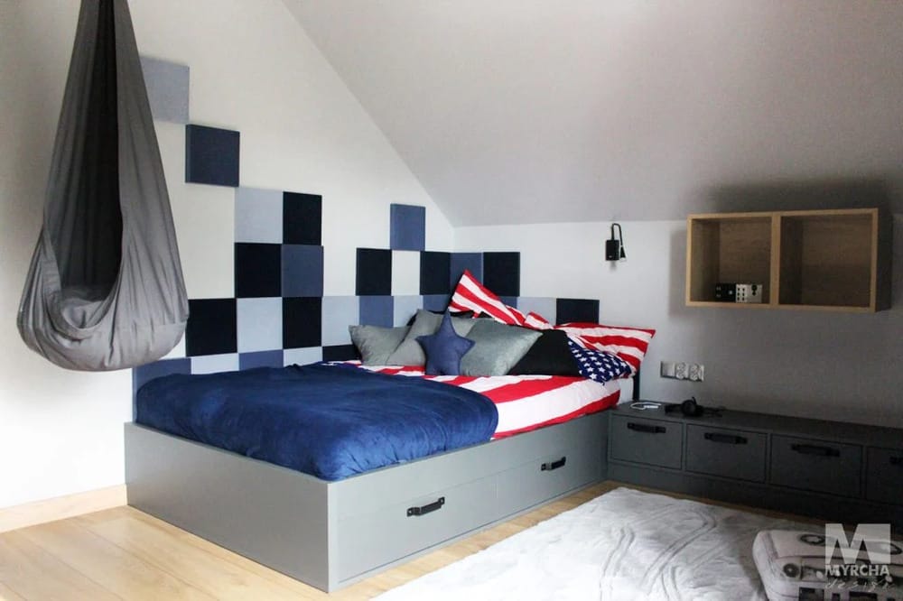 Das nutzbare Dachgeschoss dient als privater Bereich des Hauses. Hier befindet sich das Hauptschlafzimmer mit Zugang zur Terrasse und zwei begehbaren Schränken, die praktischen Stauraum bieten. Daneben befinden sich ein geräumiges Badezimmer sowie zwei komfortable Kinderzimmer. Der offene Erholungsraum in der Nähe der Treppe kann als Entspannungs- oder Arbeitsbereich eingerichtet werden.