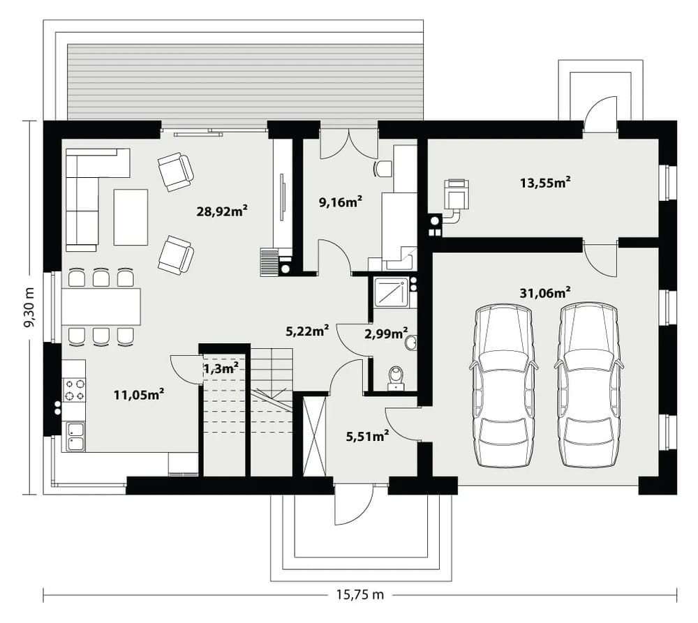Das Haus verbindet Modernität mit einer praktischen Raumaufteilung und schafft so einen idealen Lebensraum für eine Familie, die Wert auf Funktionalität und Ästhetik legt.