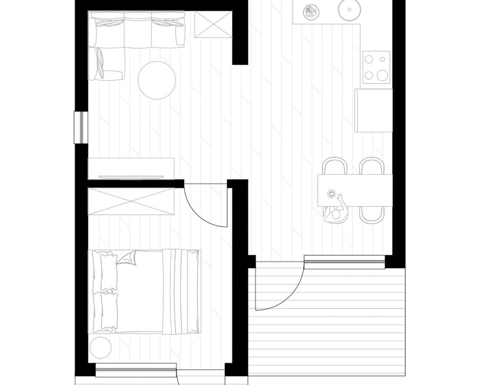 Dieses Fertighaus bietet 43,4 m² Wohnfläche mit 1 Schlafzimmer und 1 Badezimmer.