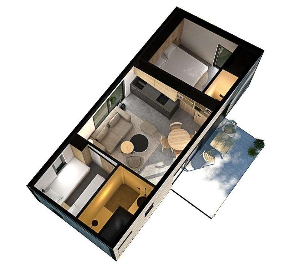 Leisure Lodge 35m² ist ein modulares Haus von Tiny House World, einem Hersteller von Fertighäusern mit Sitz in den Niederlanden. Dieses Fertighaus hat eine Wohnfläche von 35 m², 2 Schlafzimmer und 1 Badezimmer. Weitere Informationen finden Sie in der technischen Beschreibung unten.