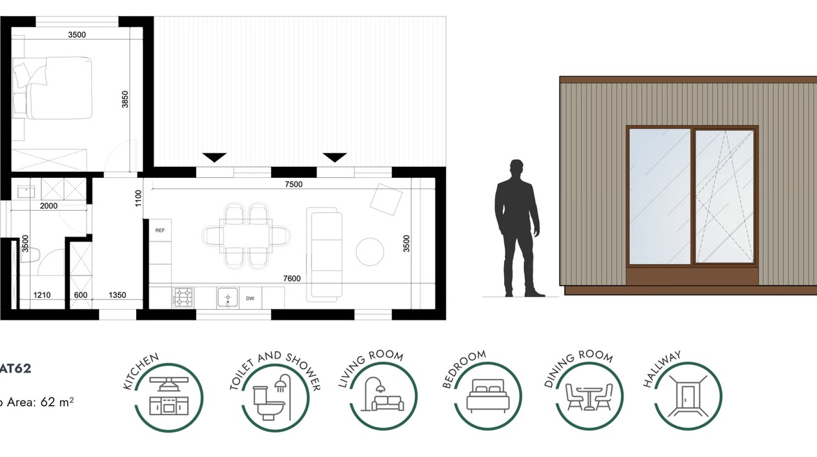 THFLAT62 ist eine modulare Hütte, die von tutumHOUSE, einem Fertigbauer mit Sitz in Litauen, gebaut wurde. Diese Hütte bietet 62 m² Wohnfläche, mit einem Schlafzimmer und einem Badezimmer.
