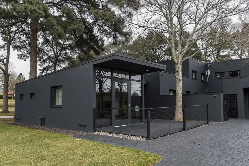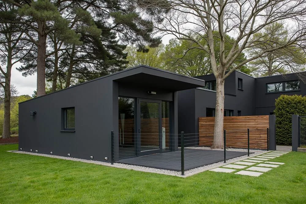 Unsere Modulhäuser mit Fenster- und Türanschlüssen in elegantem Anthrazit bieten nicht nur Ästhetik, sondern auch eine hervorragende Wärmedämmung. PVC-Mehrkammerprofile und Dreifachverglasung ermöglichen ganzjährigen Komfort und Energieeinsparungen und erfüllen gleichzeitig alle Standards für Wohnungen für Menschen mit Behinderungen.