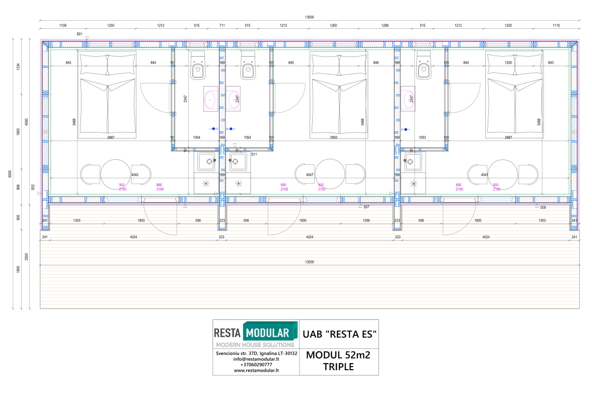 Modul 63 m² es una casa modular construida por Resta ES, un Fabricante de prefabricados con sede en Lituania. Esta casa modular ofrece 52 m² de espacio habitable con tres unidades, cada una de las cuales contiene un dormitorio y un cuarto de baño.