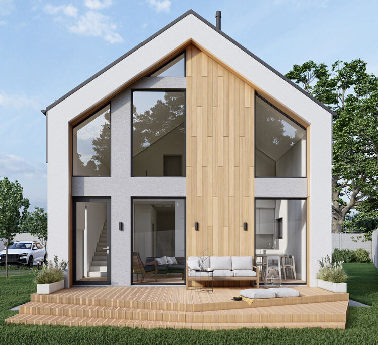 Façade : Bardage ventilé en pin thermoformé + enduit décoratif (KABE, Pologne)