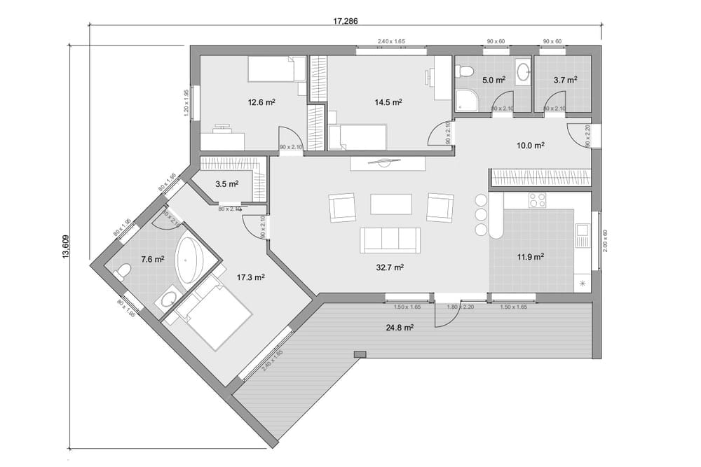 Type de maison : Maison de plain-pied Surface totale : 143,6 m2 Surface habitable : 118,8 m2 Terrasse, abri voiture : 24,8 m2 Longueur : 17,3 m Largeur : 13,6 m Chambres : 3 Salles de bains : 2Aménagement du 1er étage1. Couloir : 10,0 m2 2. Local technique : 3,7 m2 3. Salle de bain : 5.0 m2 4. Séjour + cuisine : 44.6 m2 5. Chambre à coucher : 14.5 m2 6. Chambre à coucher : 12.6 m2 7. Chambre à coucher : 17.3 m2 8. Armoire : 3.5 m2 9. Salle de bain : 7,6 m2 Surface habitable totale : 118.8 m2