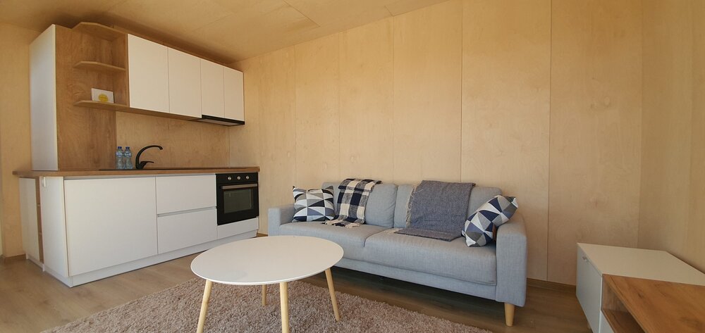 34 sq.m. of living space featuring a bright living room with a kitchen corner,