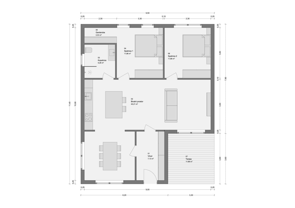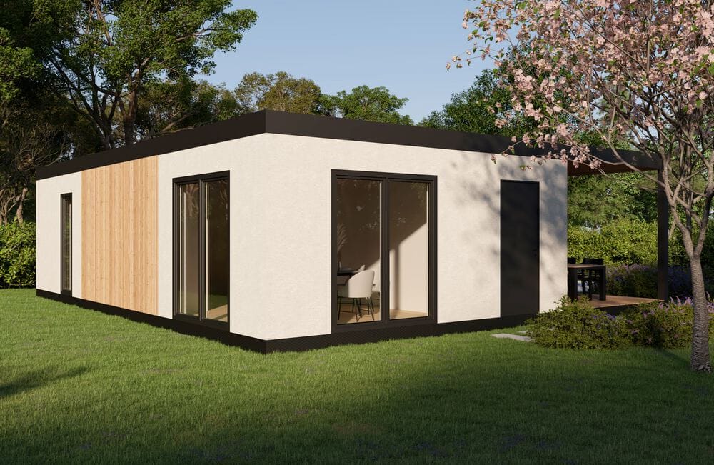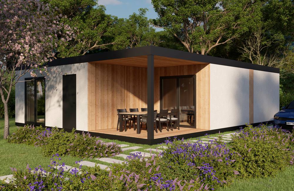 Cubie 96 is a modular home built by Hrovat, a manufacturer based in Slovenia. This prefab house provides 96 m² of living space, with two bedrooms and one bathroom.
