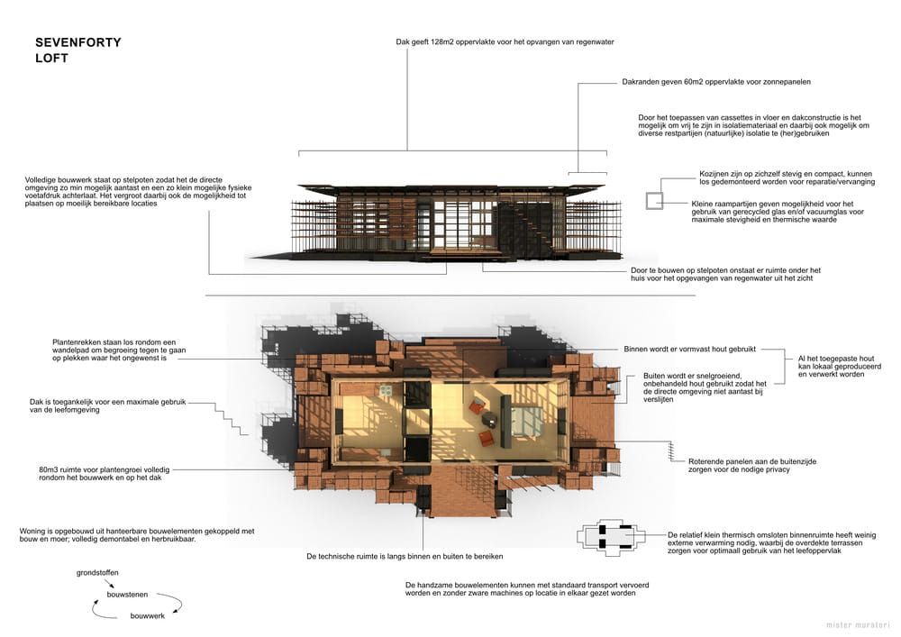 740 Loft is a prefab house built by Mister Muratori, a prefab manufacturer based in The Netherlands. This prefab house provides 49.3 m2 of living space, with 1 bedroom and 1 bathroom.