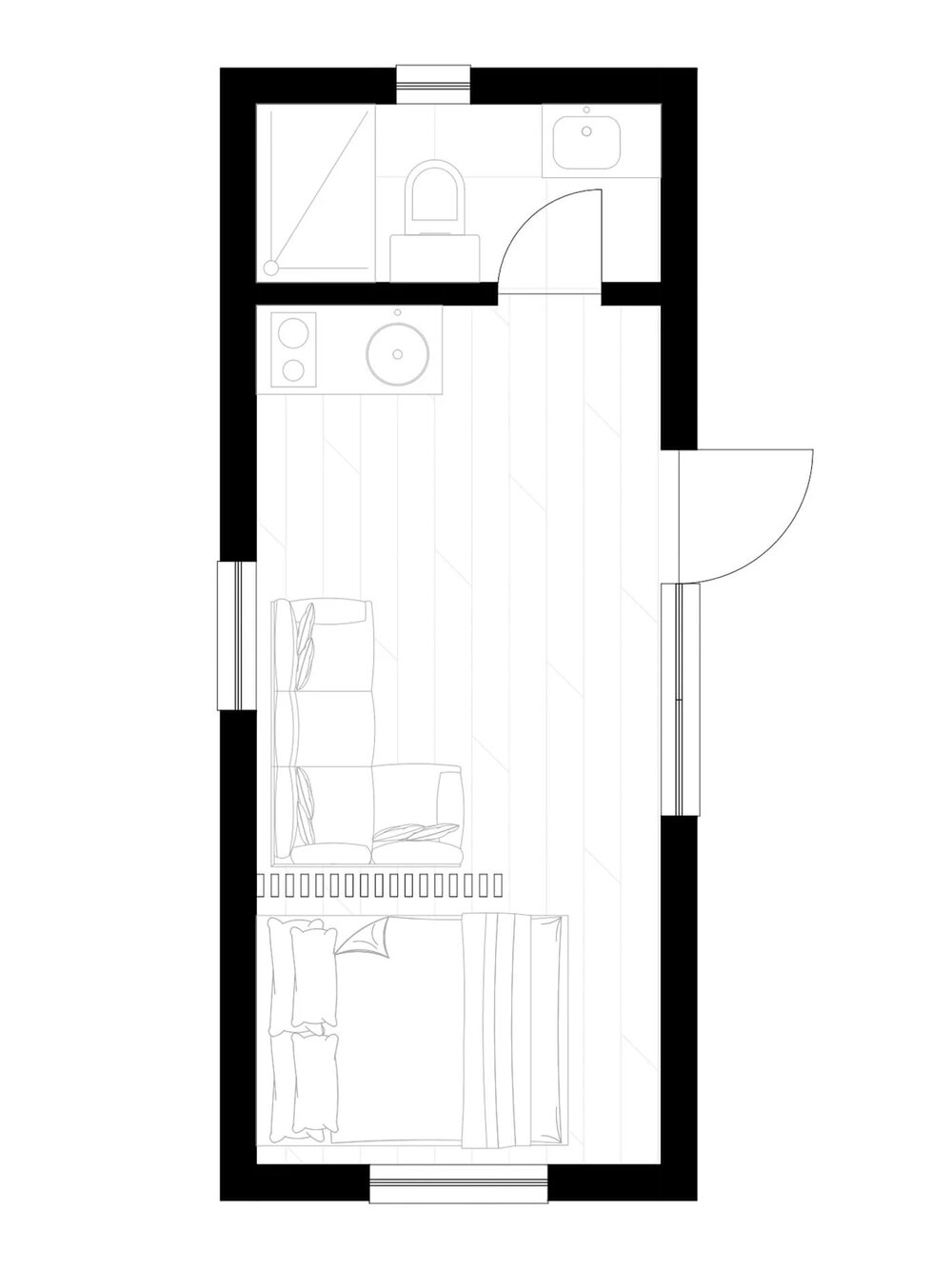 This prefab house provides 24.3 m² of living space, with 2 bedrooms and 1 bathroom.