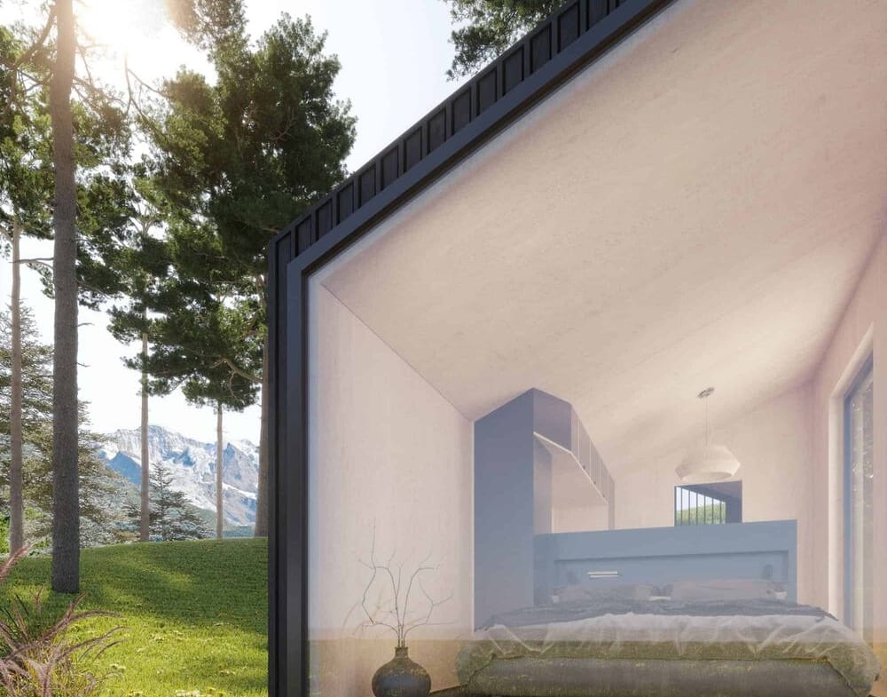 Anchored with large screws for light foundations, it ensures minimal impact on the land while providing lasting stability. Fully connectable to electricity, water, and sewage, it offers all the comforts of a traditional home with a sleek, modern design.