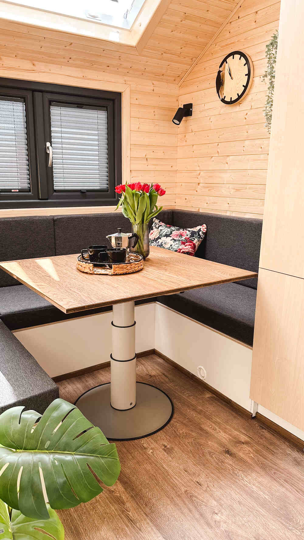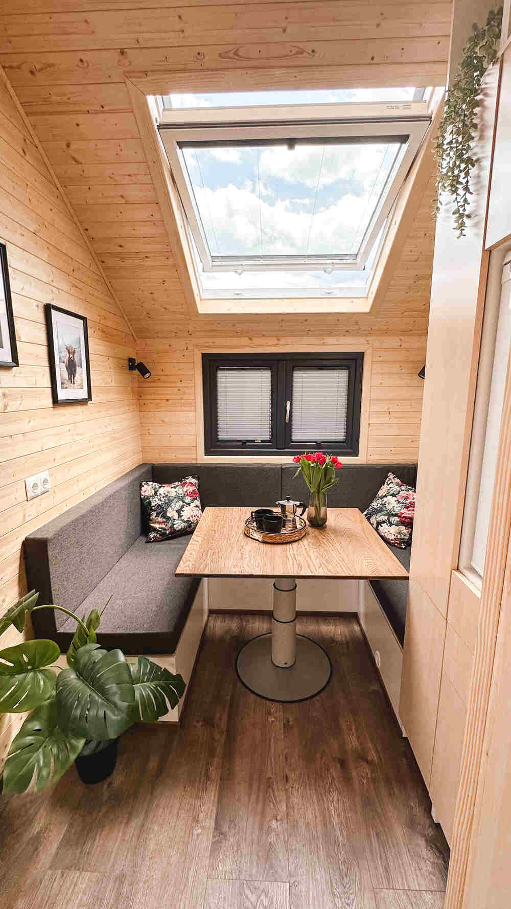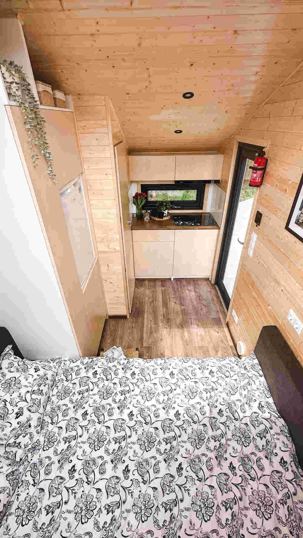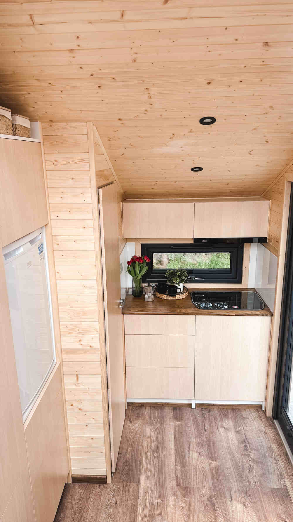 Ons kleinste model voor 1-2 personen, perfect voor off-grid versie. Compact tiny house dat alles heeft wat nodig is en een ruim dakraam waardoor u vanuit uw knusse bed naar de sterren kunt kijken.