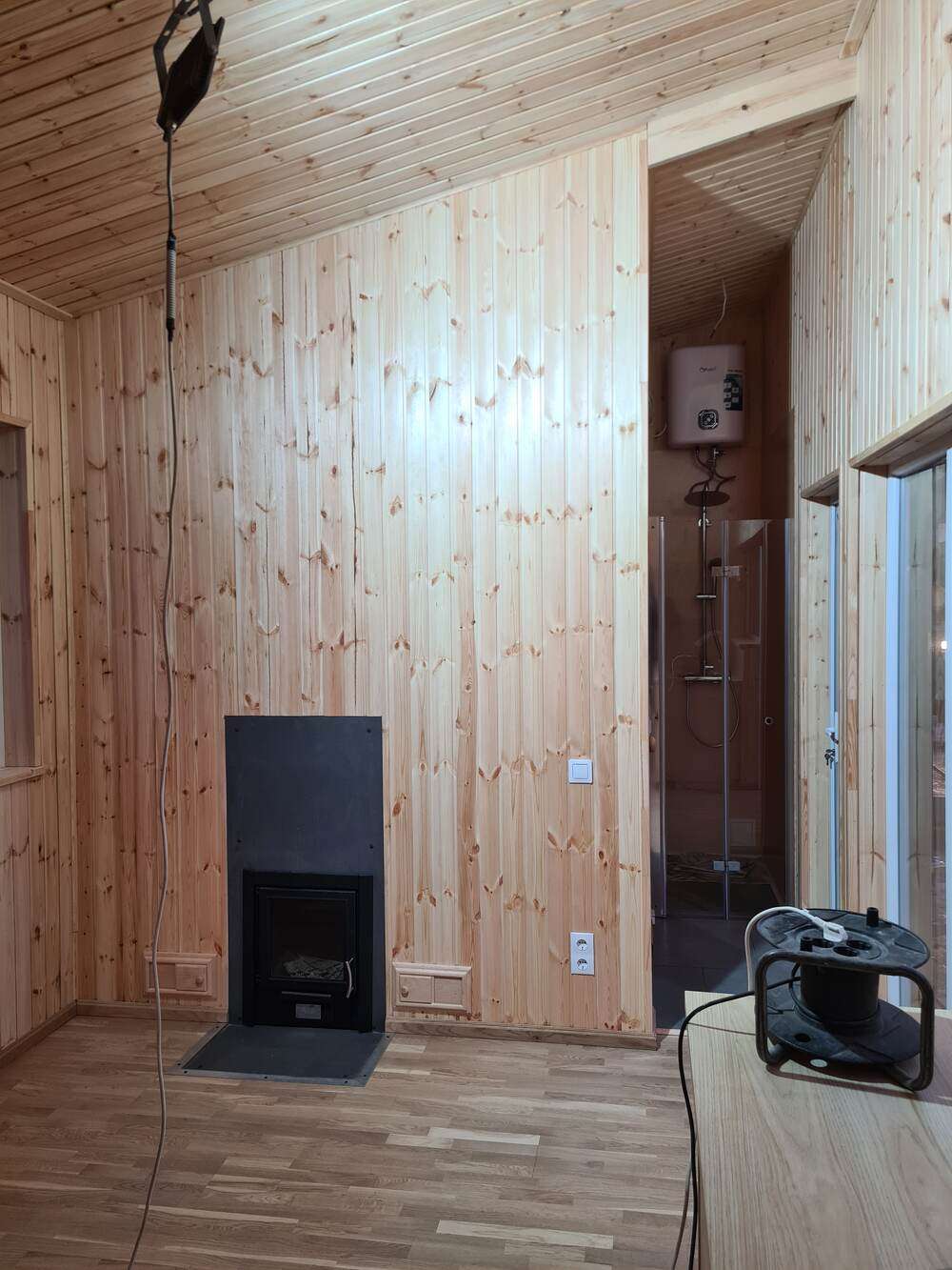 Woonkamer met keukenapparatuur, aparte sauna en doucheruimte. De houtgestookte open haard door de muur zorgt voor een gezellige en warme sfeer.