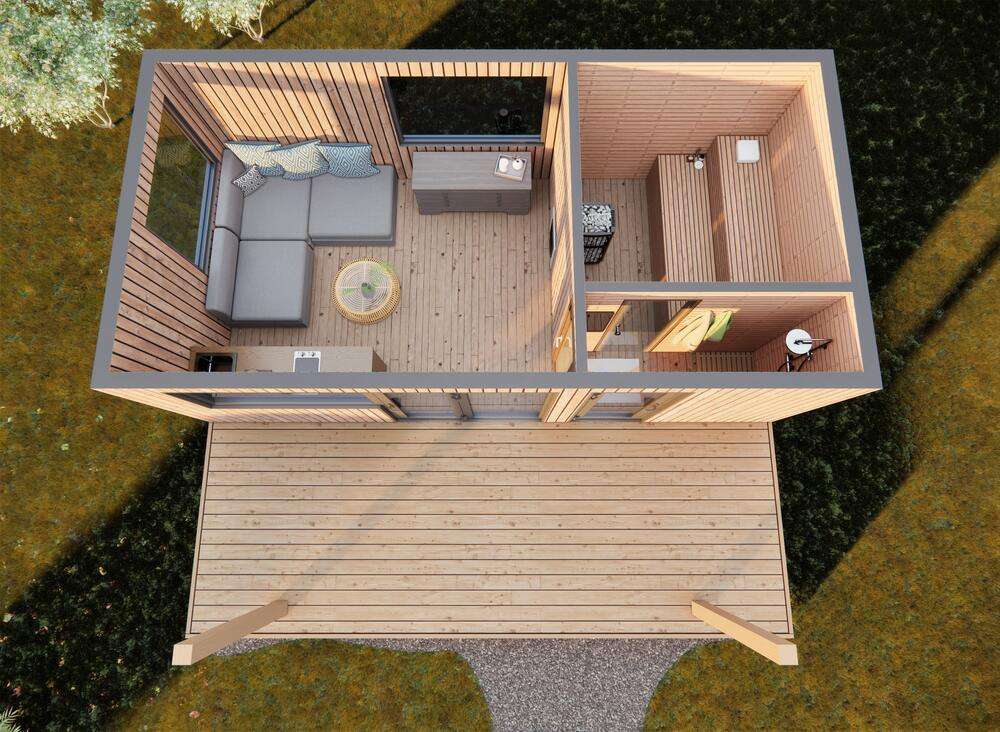 Sauna 20 is een modulaire hut gebouwd door EcoSpace, een prefab fabrikant uit Letland. Dit prefab huis biedt 20 m² woonruimte, geschikt voor 2 personen.