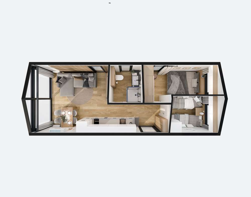 Mobile house E is een modulaire woning op wielen gebouwd door MOMO Development, een prefab Fabrikant gevestigd in Zweden. Dit prefab huis heeft een woonoppervlakte van 36 m², met 2 slaapkamers en 1 badkamer.