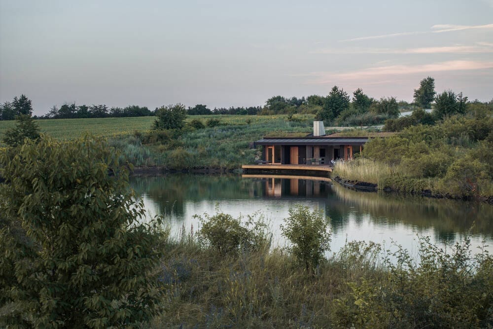 - Böjda arkitektoniska element som speglar den intilliggande dammen
