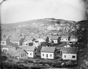 Flyttbara hus i den så kallade ”Happy Valley” i San Francisco Bay under guldrushen (del av panorama från 1851 från California Historical Society).