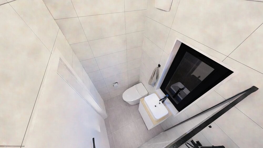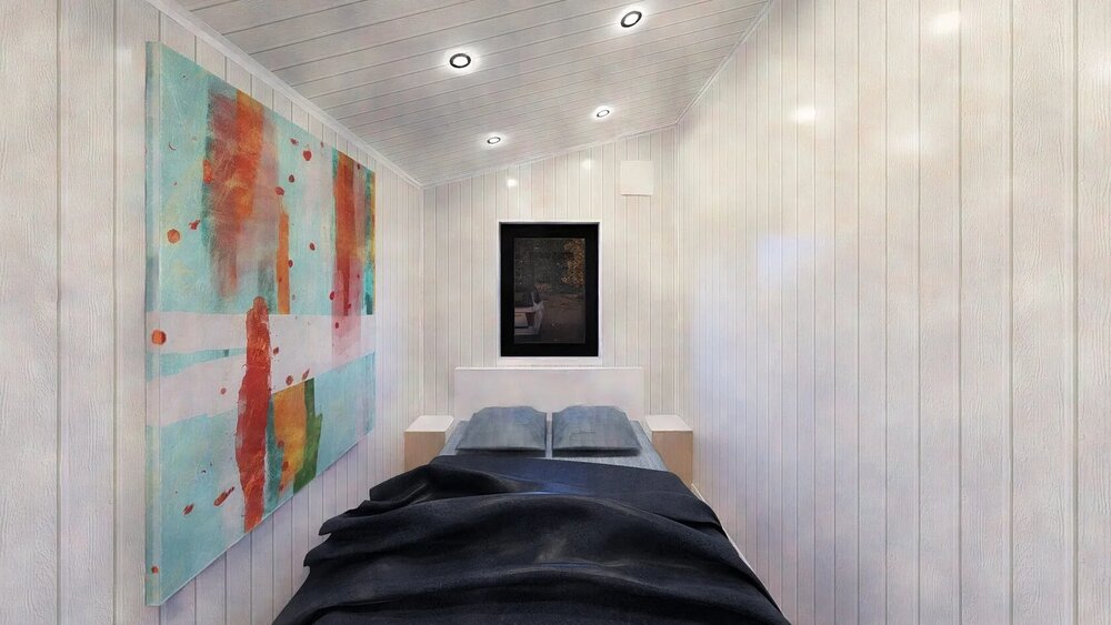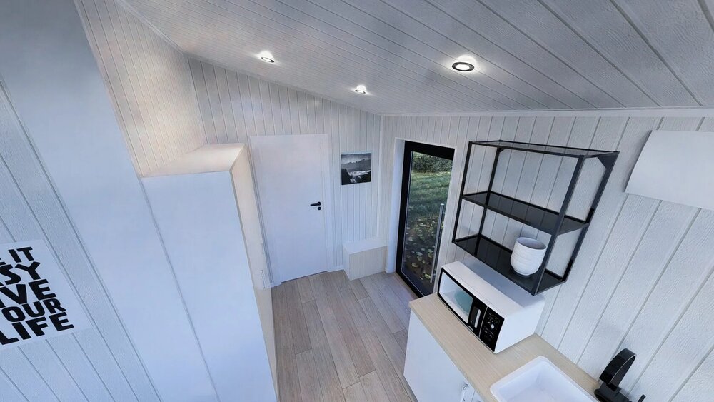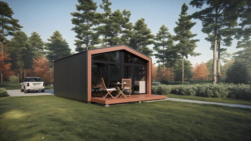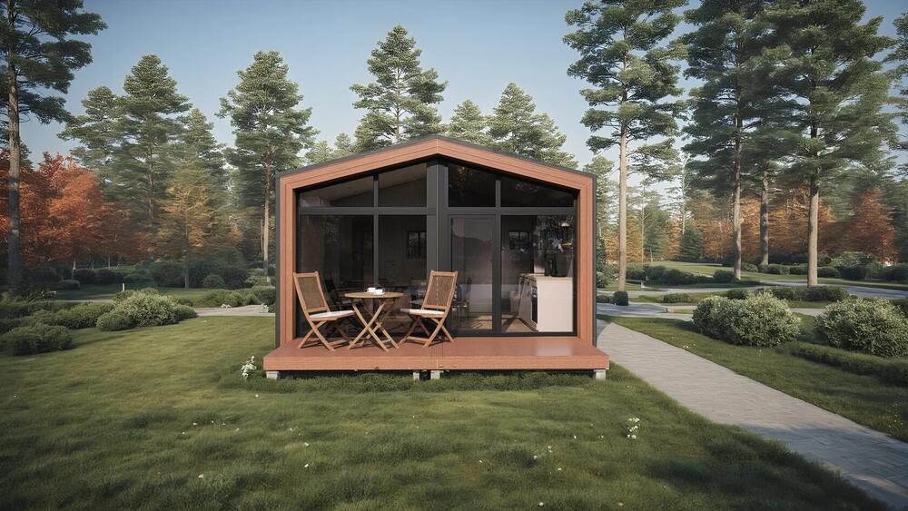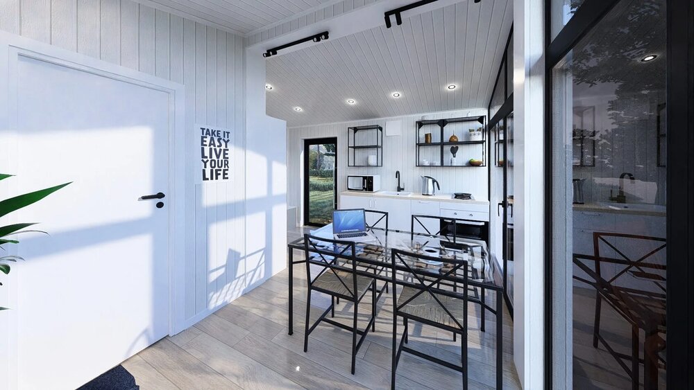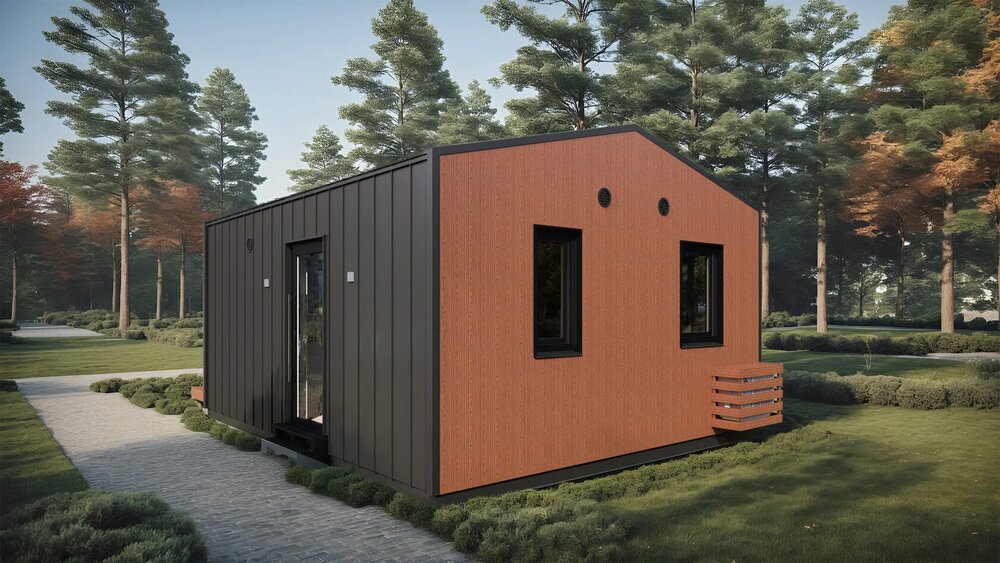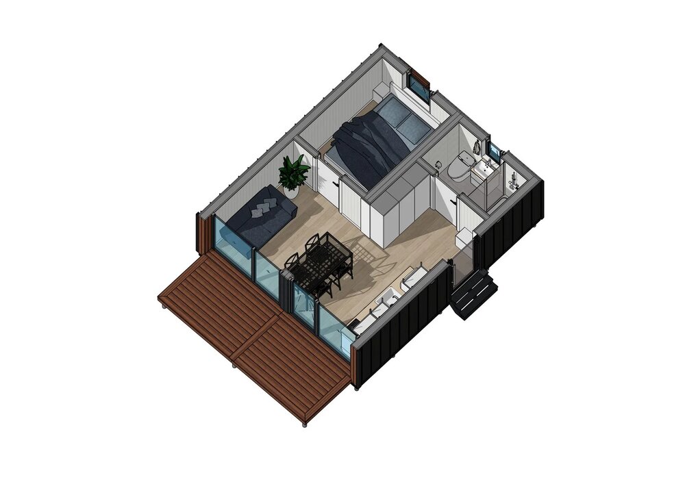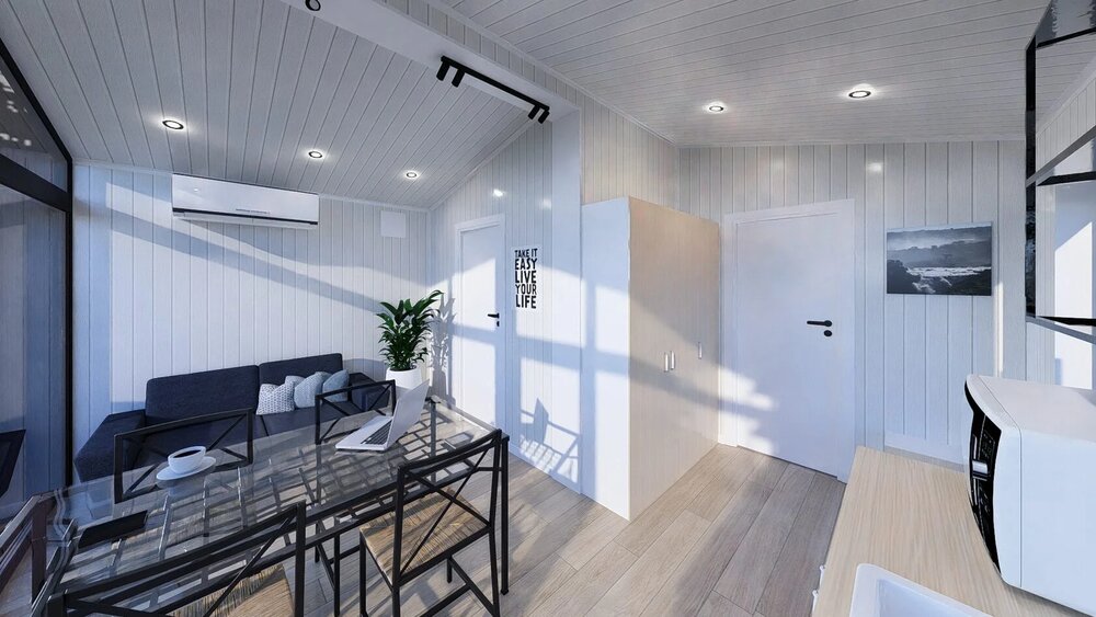 Ett modulhus med ett separat sovrum och slående panoramafönster från golv till tak. Det ljusa vardagsrummet med öppen planlösning kombinerar komfort och modern design - perfekt för en elegant semesterresa eller året runt-boende.