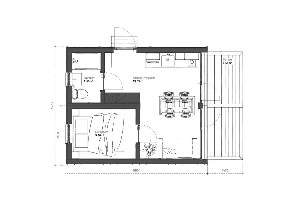 Ett hem i ladugårdsstil erbjuder ett separat sovrum och ett rymligt vardagsrum med kök och matplats. Panoramafönster översvämmar interiören med naturligt ljus och skapar en luftig och modern atmosfär - perfekt för par eller små familjer.