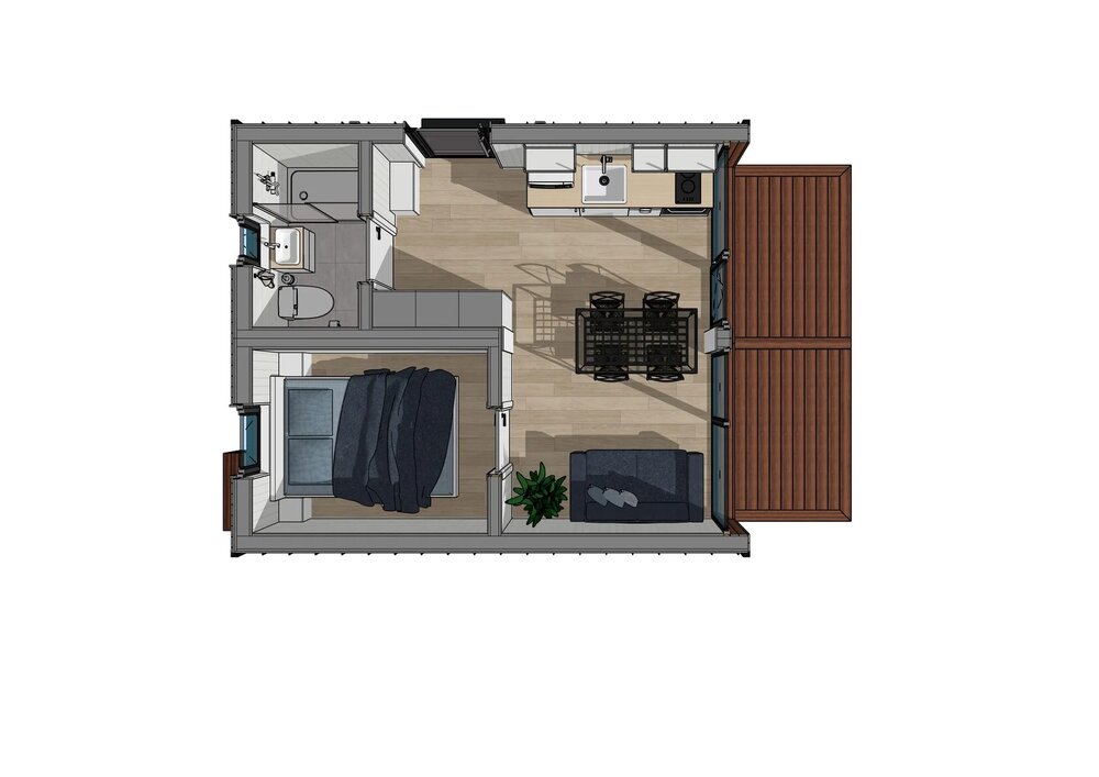 Detta prefabricerade hus har en boyta på 30 m², 1 sovrum och 1 badrum.