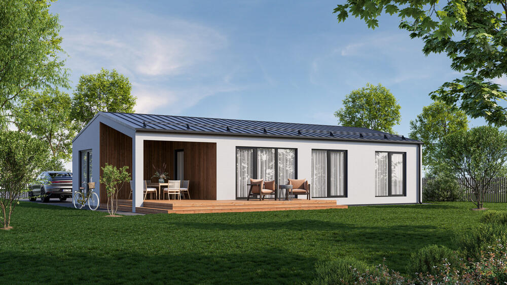 Detta prefabricerade hus erbjuder 80 m² boyta, med 3 sovrum och 1 badrum.