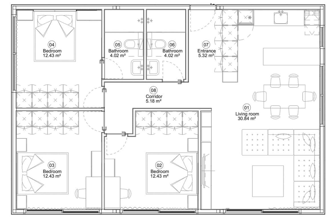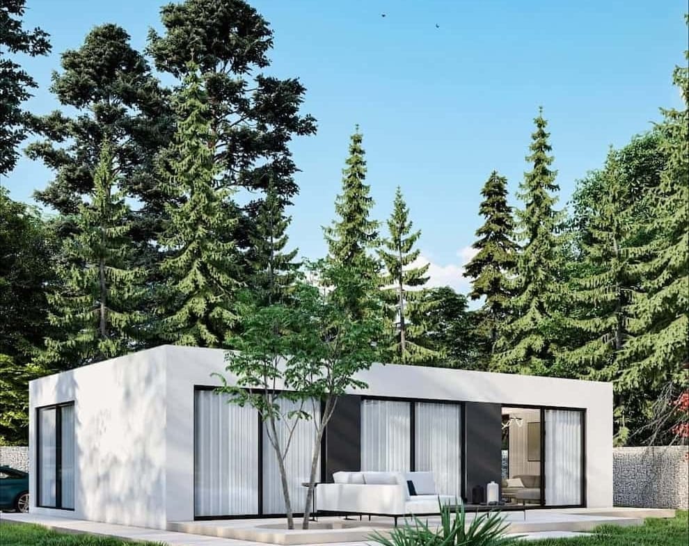 Trio är ett modulhus som byggts av We Modular, en prefabtillverkare baserad i Bulgaria. Detta prefabricerade hus erbjuder 96 m² boyta, med 3 sovrum och 2 badrum.